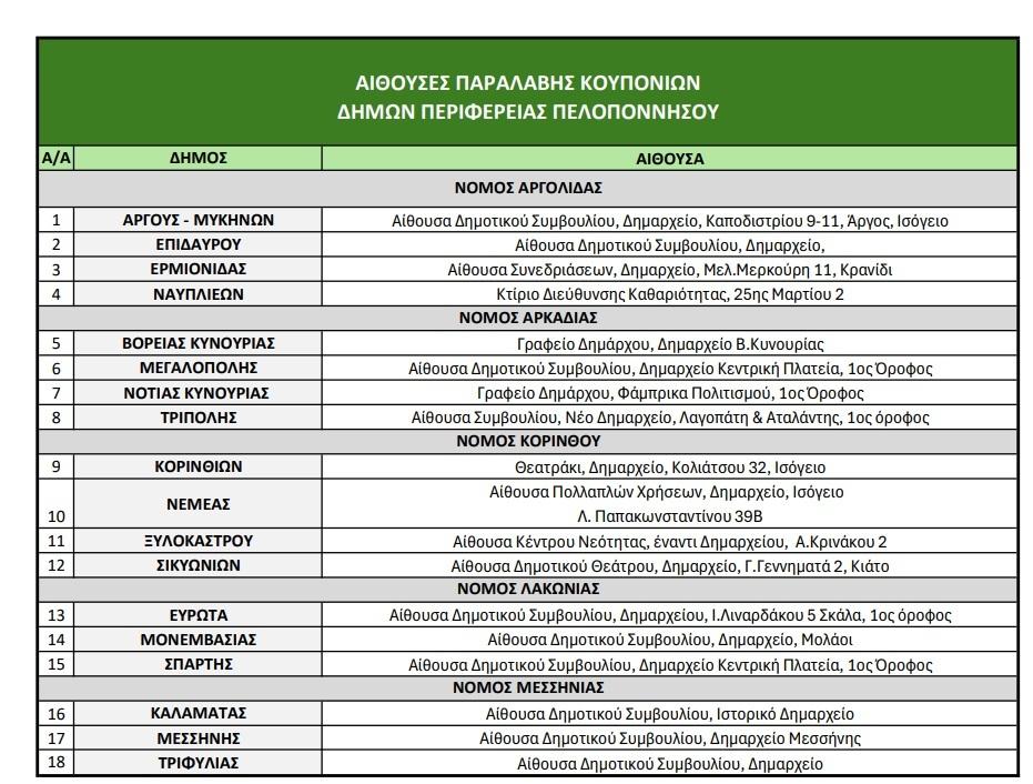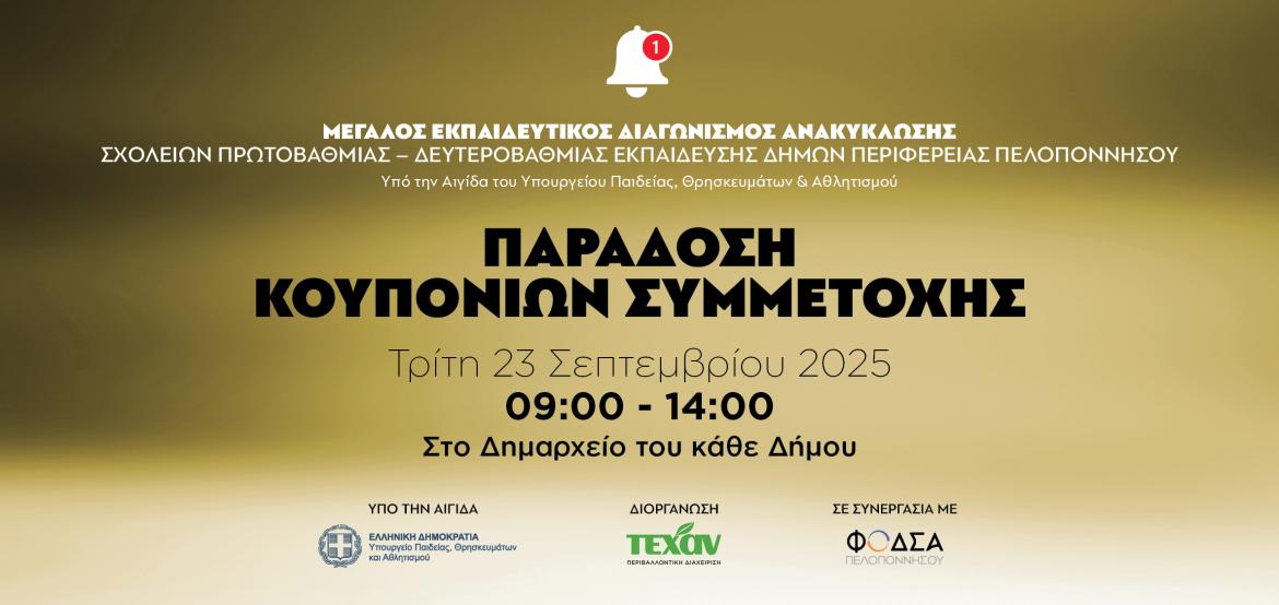 Σύμφωνα με τους όρους του Διαγωνισμού, ο εκπρόσωπος κάθε σχολικού τμήματος, για να συμμετάσχει στο Μεγάλο Εκπαιδευτικό Διαγωνισμό Ανακύκλωσης Σχολείων Πρωτοβάθμιας και Δευτεροβάθμιας Εκπαίδευσης των Δήμων Περιφέρειας Πελοποννήσου, θα πρέπει, την Τρίτη 23 Σεπτεμβρίου 2025, από 9:00 π.μ. έως 2:00 μ.μ., να παραδώσει σε αίθουσα, που έχει καθοριστεί στο Δημαρχείο ή σε προκαθορισμένο κτίριο του εκάστοτε Δήμου, το σύνολο των κουπονιών, που έχει συγκεντρώσει το κάθε τμήμα. Οι αίθουσες παράδοσης των συμμετοχών έχουν αναρτηθεί ΕΔΩ.
