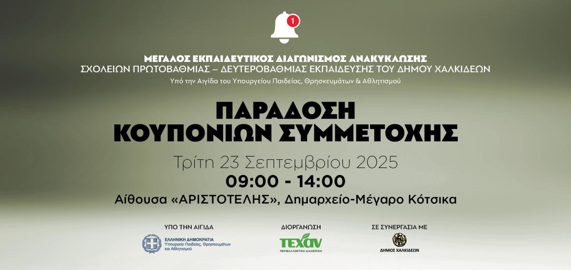 Η ανακήρυξη των σχολικών τμημάτων που θα κερδίσουν τα τρία (3) δώρα - έπαθλα του Μεγάλου Εκπαιδευτικού Διαγωνισμού Ανακύκλωσης Σχολείων Πρωτοβάθμιας και Δευτεροβάθμιας Εκπαίδευσης του Δήμου Χαλκιδέων θα πραγματοποιηθεί την Παρασκευή 26 Σεπτεμβρίου 2025 και τα αποτελέσματα θα αναρτηθούν στην ιστοσελίδα https://recycling-center.gr/ .