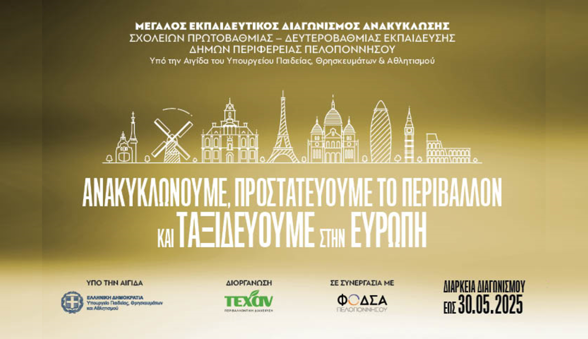 Η εταιρεία ΤΕΧΑΝ Α.Β.Ε.Ε., ηγέτης στην κυκλική οικονομία και τις δράσεις ανακύκλωσης, εγκαινιάζει τη νέα σειρά Μεγάλων Εκπαιδευτικών Διαγωνισμών Ανακύκλωσης για το 2025, ξεκινώντας από την Περιφέρεια Πελοποννήσου, σε συνεργασία με τον Φο.Δ.Σ.Α. Πελοποννήσου και υπό την αιγίδα του Υπουργείου Παιδείας, Θρησκευμάτων και Αθλητισμού.
