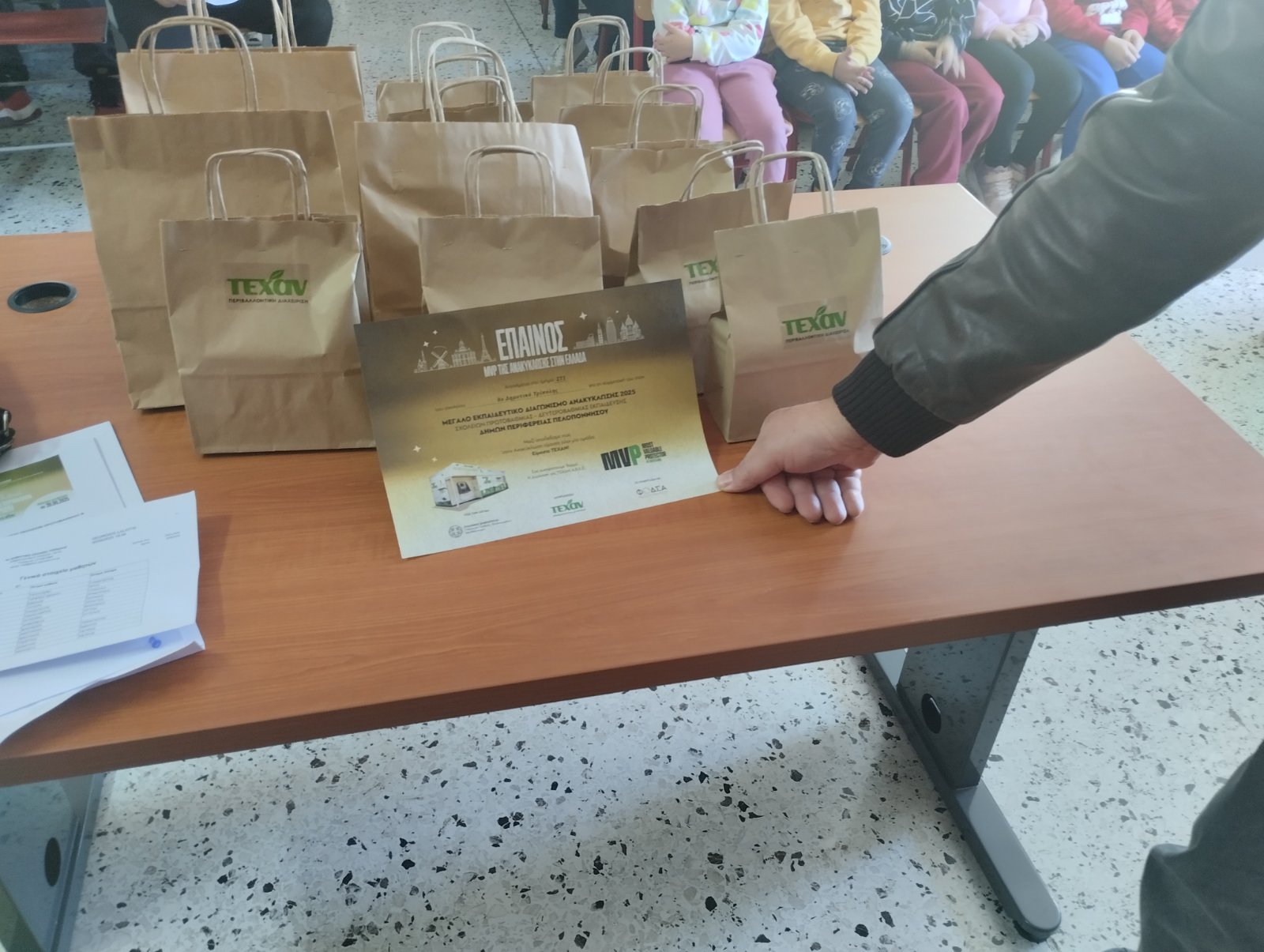 Η απονομή των δώρων πραγματοποιήθηκε στο 8o Δημοτικό Σχολείο της Τρίπολης που φοιτούσαν τα παιδιά στο τμήμα ΣΤ1 κατά το σχολικό έτος 2024-5, κατά τη διάρκεια του οποίου υλοποιήθηκε ο Διαγωνισμός.